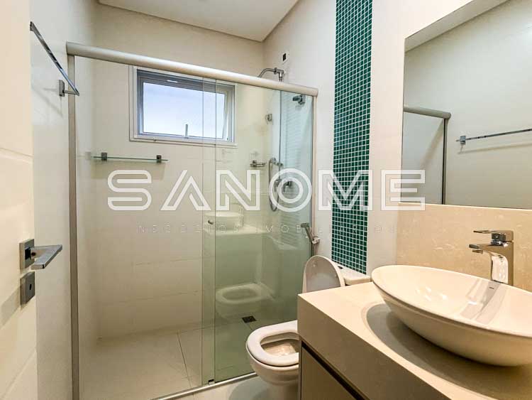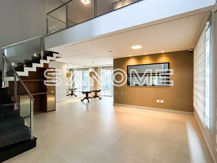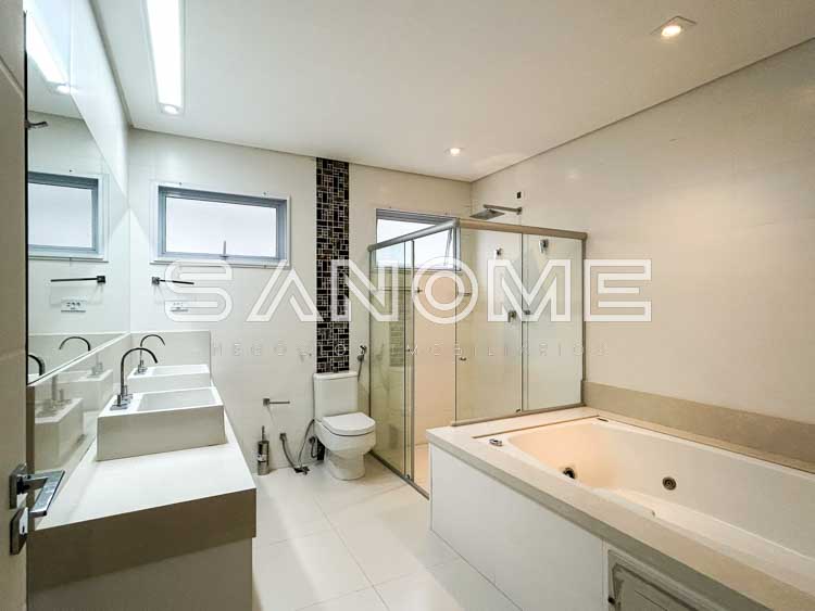 Piso superior: Sala de TV entre os quartos + 4 suítes (master com amplo closet, varanda externa e sala de banho).