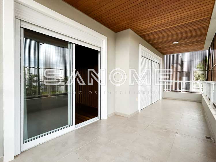Piso térreo: Sala de estar com pé direito duplo, Sala de jantar, Escritório (reversível +1 suíte), Lavabo, Sala de TV privativa, Cozinha planejada com despensa, Área de serviço, Varanda gourmet com fechamento em vidro, Banheiro de lazer externo e Piscina.
