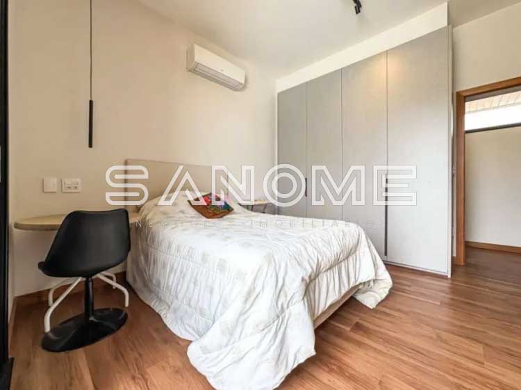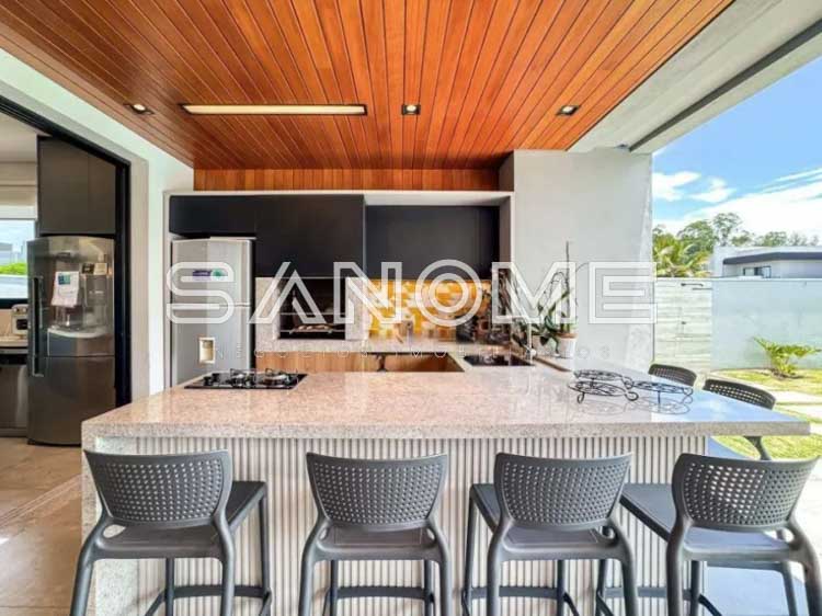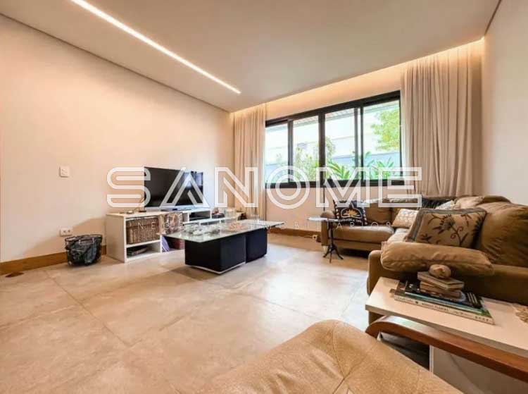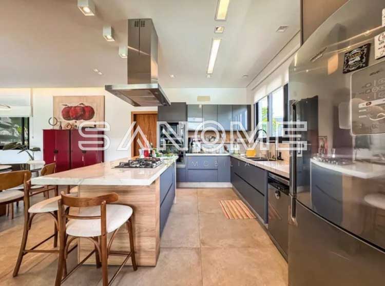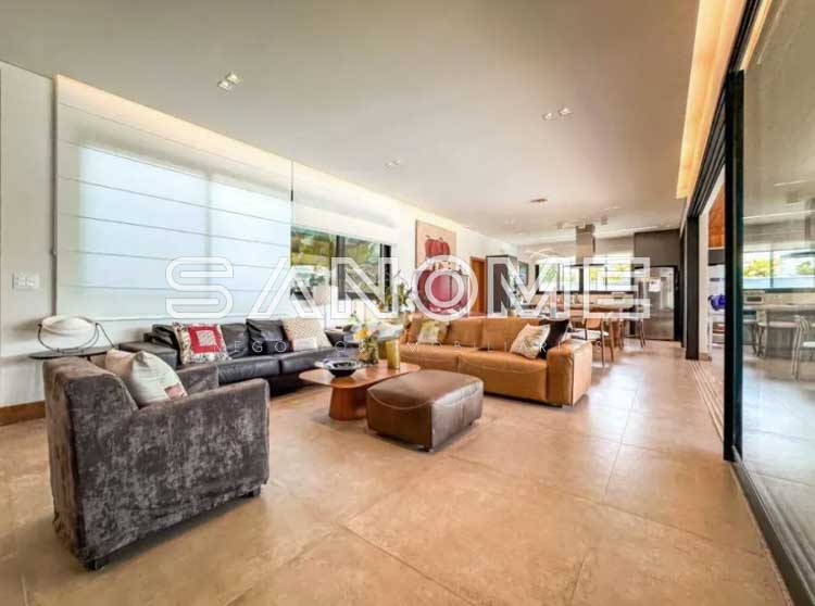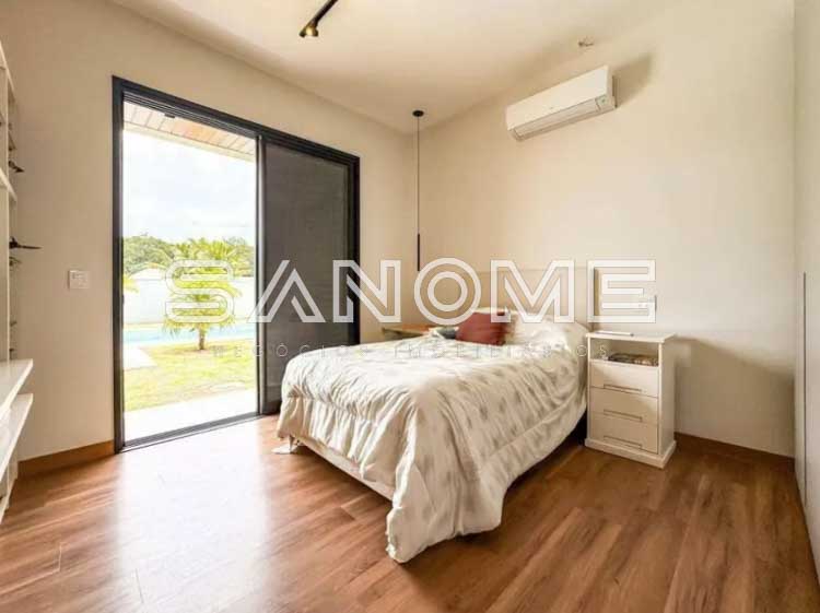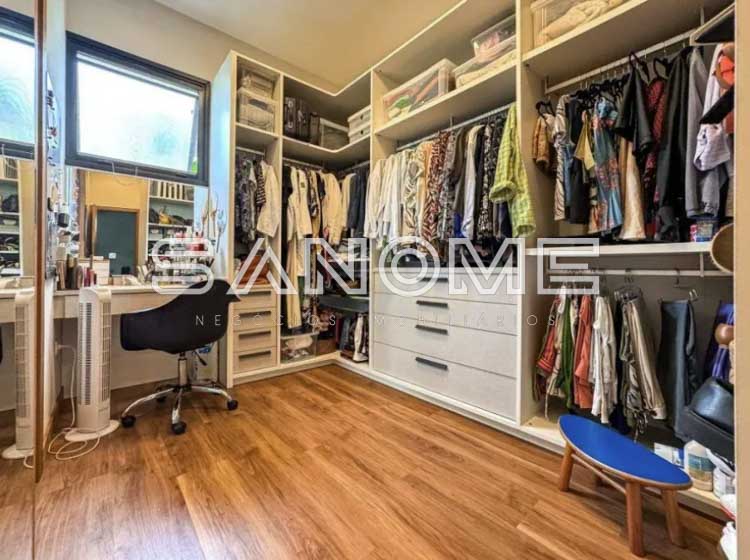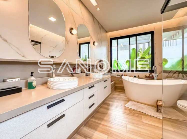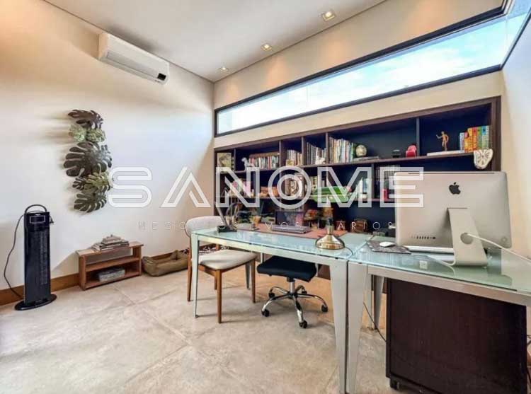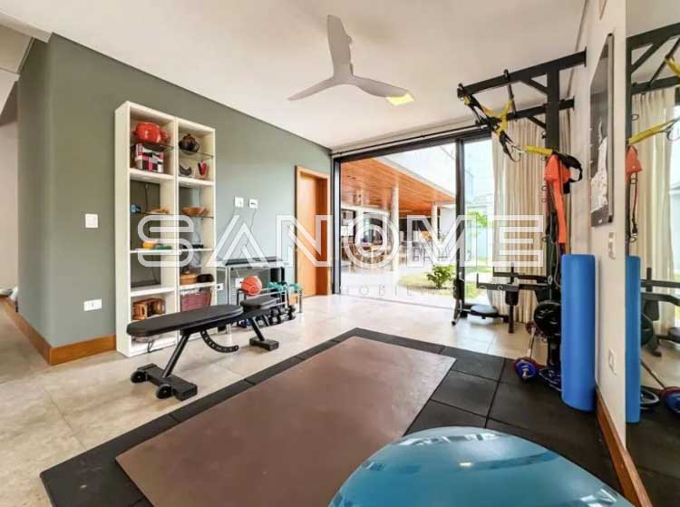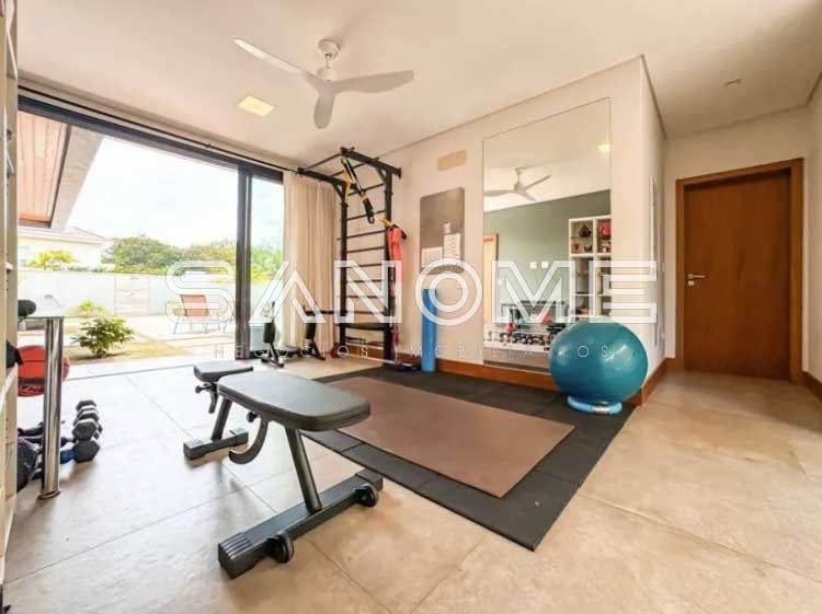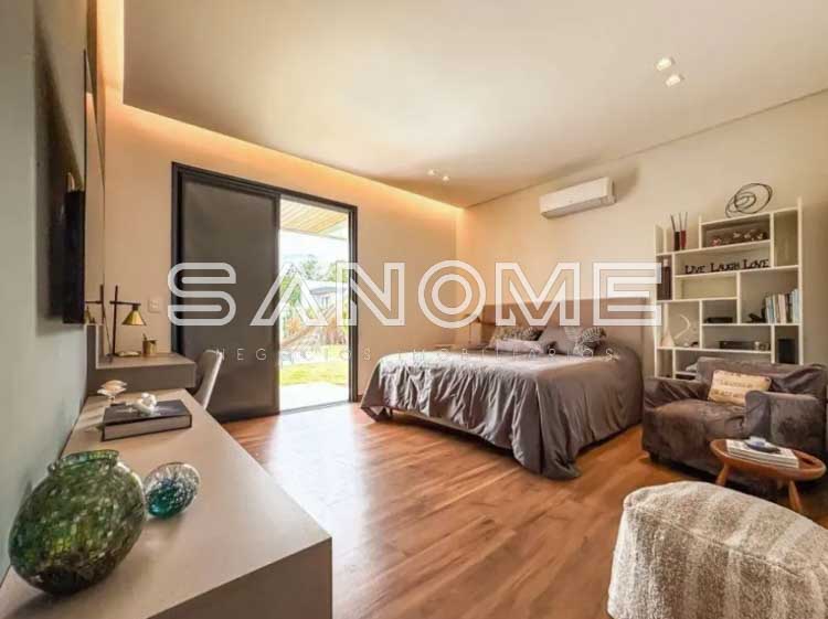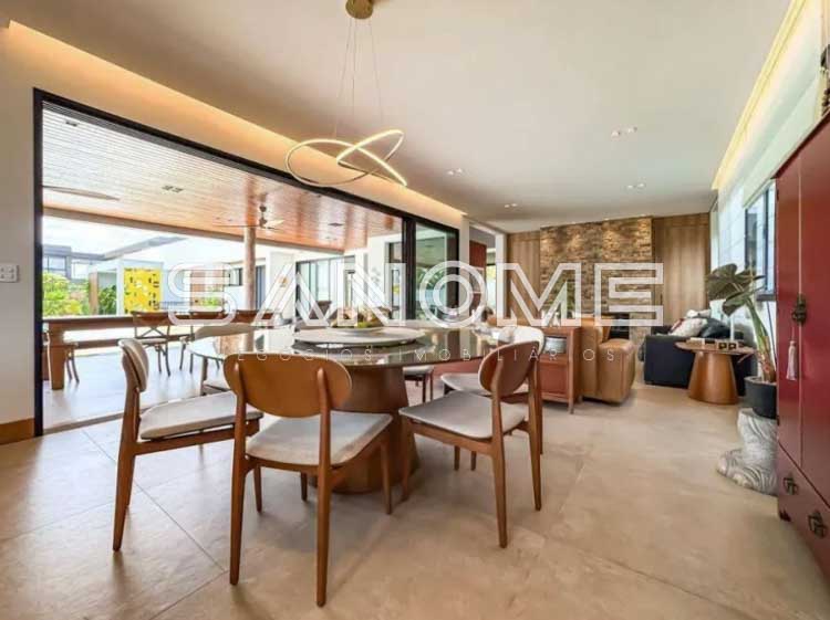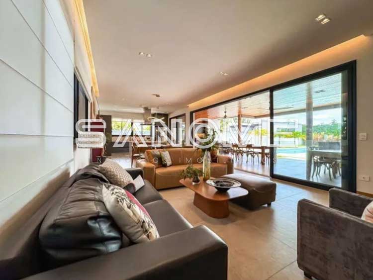 Piso térreo: 4 suítes (master com closet e banheira), Sala 3 ambientes com lareira, Lavabo, Adega, Jardim de inverno, Cozinha integrada, Despensa, Área de serviço, Área gourmet, Banheiro de lazer externo, Sala de cinema, Escritório, Sala de academia, Amplo quintal gramado e Piscina.