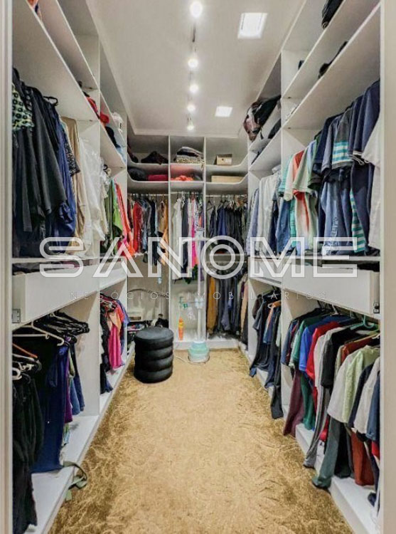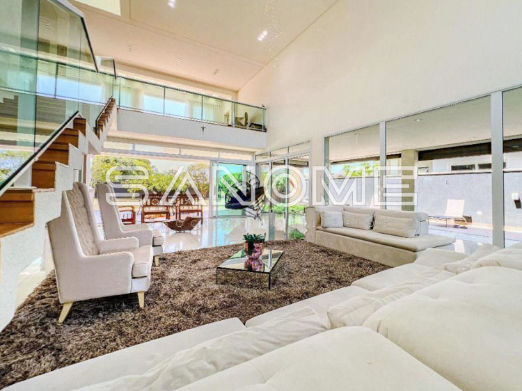 Piso térreo: Salas integradas com pé direito duplo, Lavabo, Sala de TV, Escritório com banheiro privativo, Espaço para cozinha principal (não utilizado atualmente), Copa integrada, Área de serviço, Área/cozinha gourmet completa (com fechamento em vidro e integrada a área de lazer), Banheiro de lazer externo, Amplo quintal gramado (terreno diferenciado final de rua) e Piscina privativa com SPA.