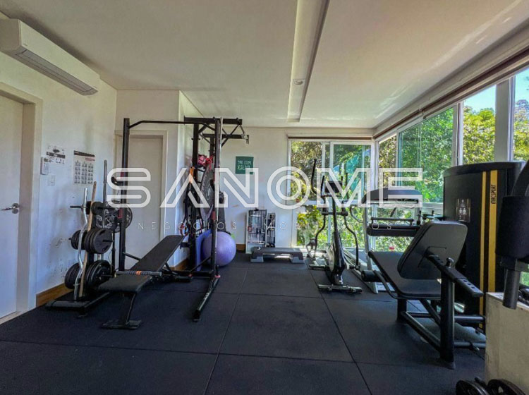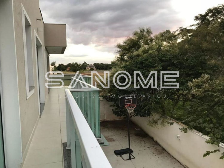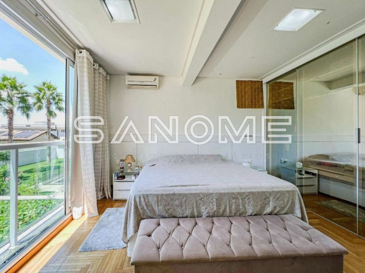 Piso superior: 5 dormitórios (3 suítes – Imensa suíte master com 2 closets e banheira), Ampla sala íntima com varanda, Academia com banheiro (uma das suítes) e Ampla varanda externa ao longo da lateral da casa com vista para mata nativa.