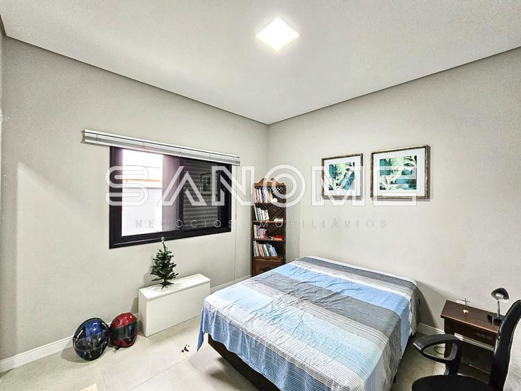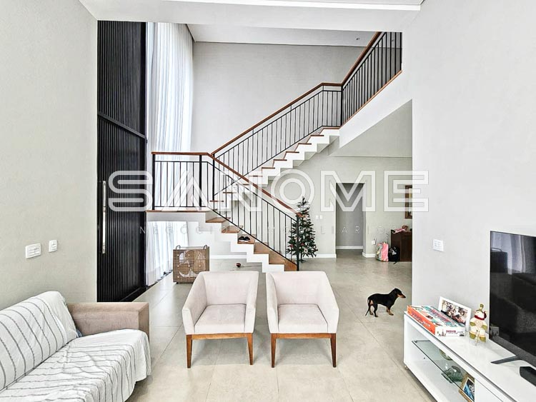 Piso superior: Sala íntima + 4 suítes (master com closet).