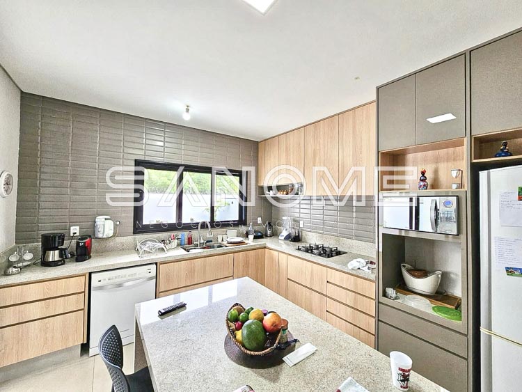 Piso térreo: 1 suíte, Sala de jantar, Sala de estar, Sala de TV, Lavabo, Escritório, Cozinha planejada, Despensa, Área de serviço, Área gourmet, Varanda externa, Banheiro de lazer externo, Quintal gramado e Piscina.
