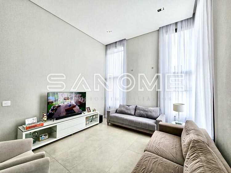 Piso superior: Sala íntima + 4 suítes (master com closet).