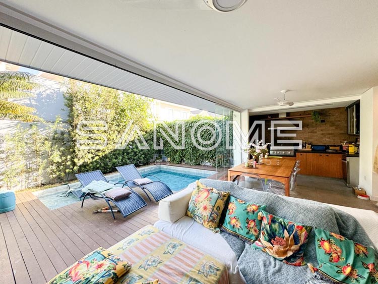 Piso térreo: Sala de estar, Sala de jantar, Sala de TV, Lavabo/Banheiro social com chuveiro, Cozinha planejada (com cooktop, forno e micro-ondas embutidos), Área de serviço, Área gourmet e Piscina aquecida.