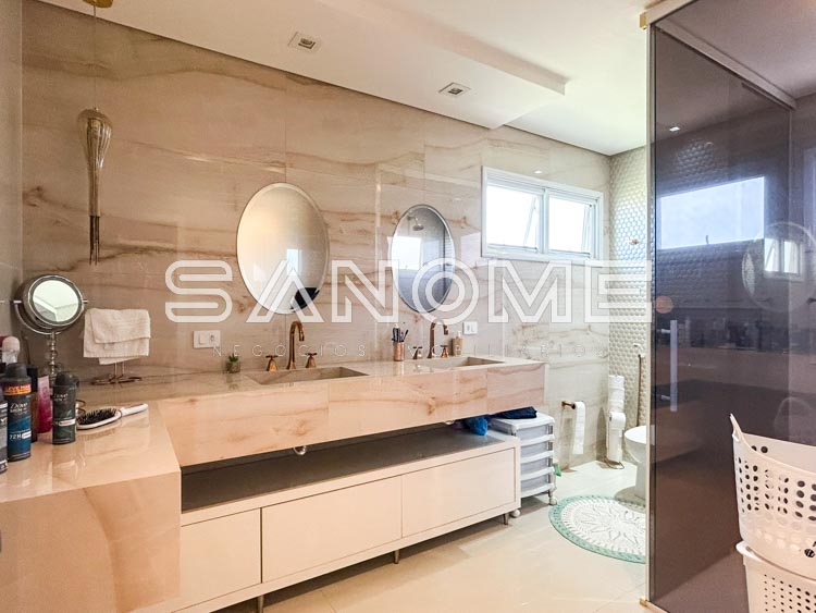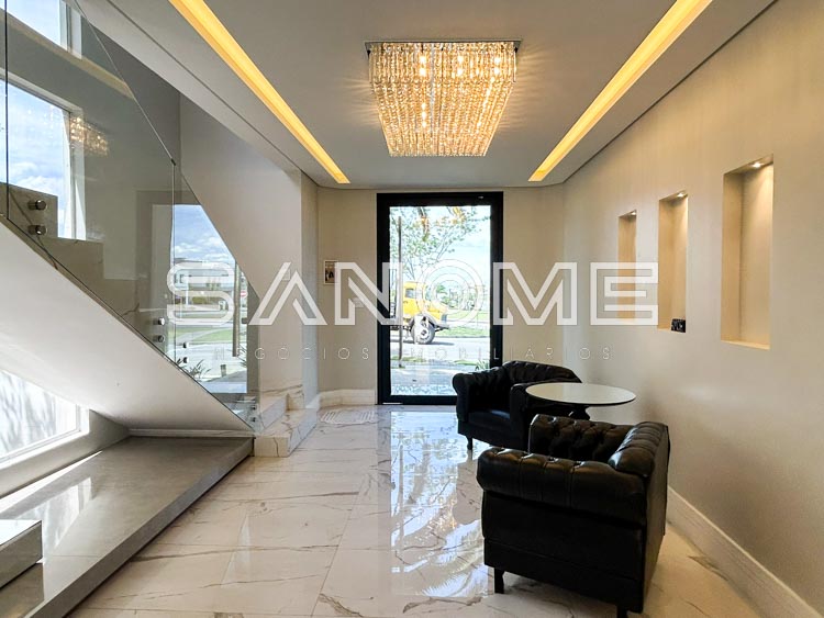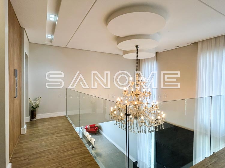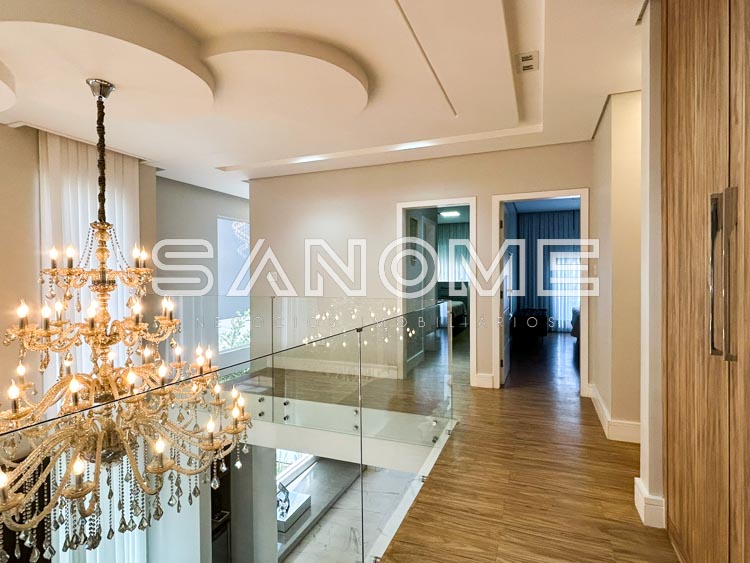Piso superior: Escritório + 4 suítes (master com closet, sala íntima, chuveiro duplo e varanda com vista).