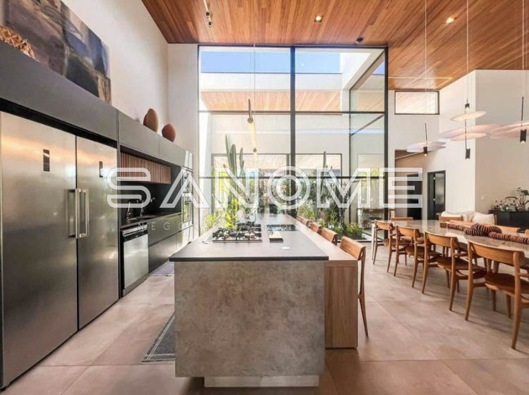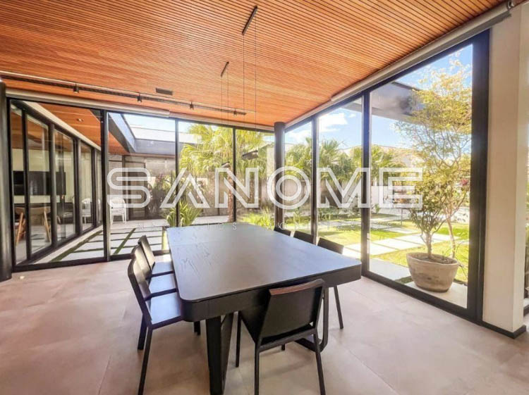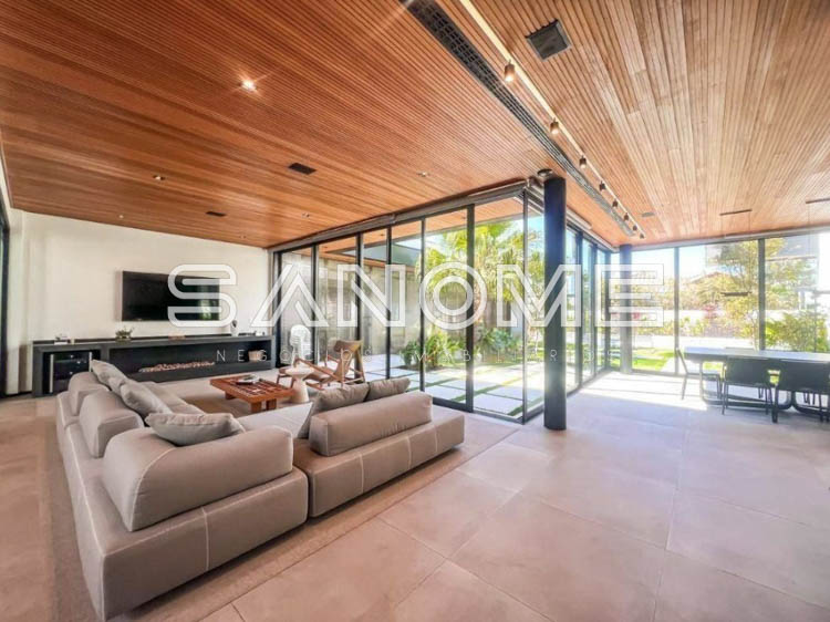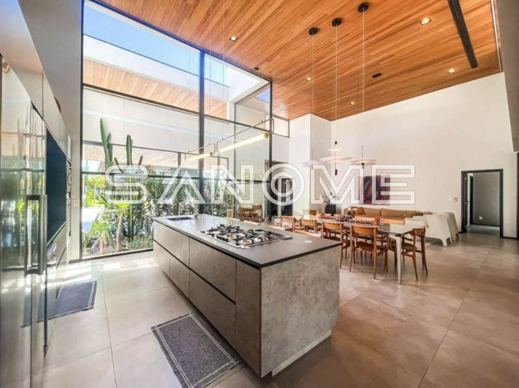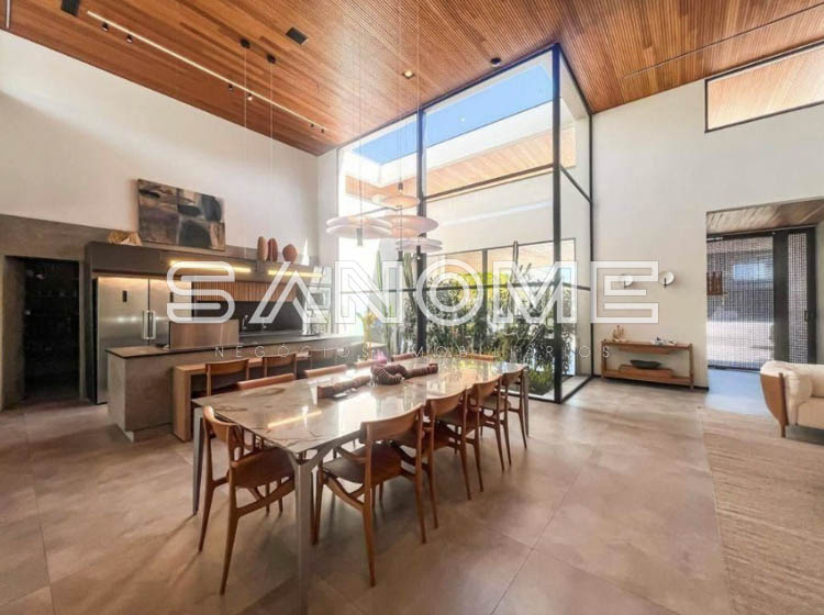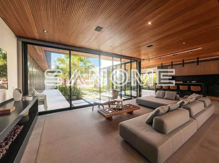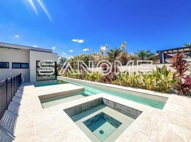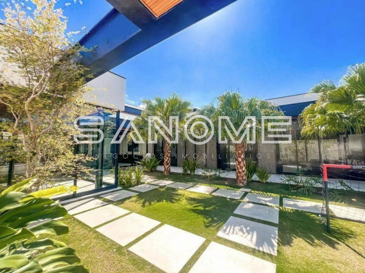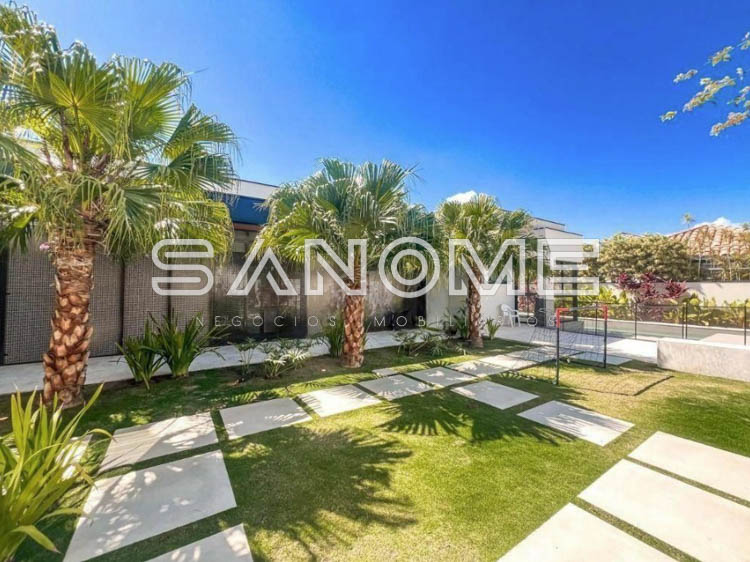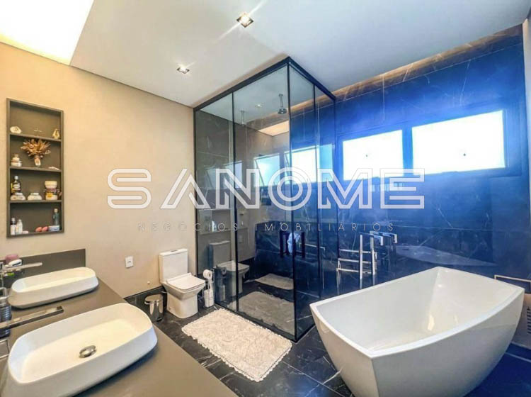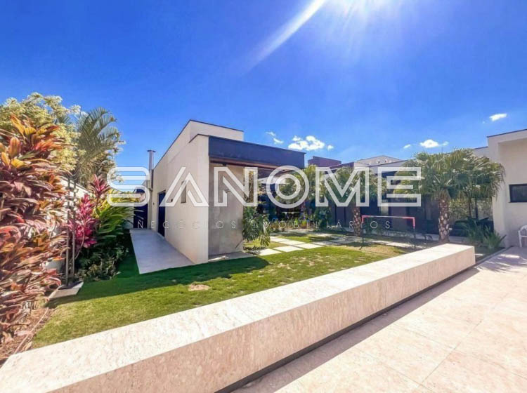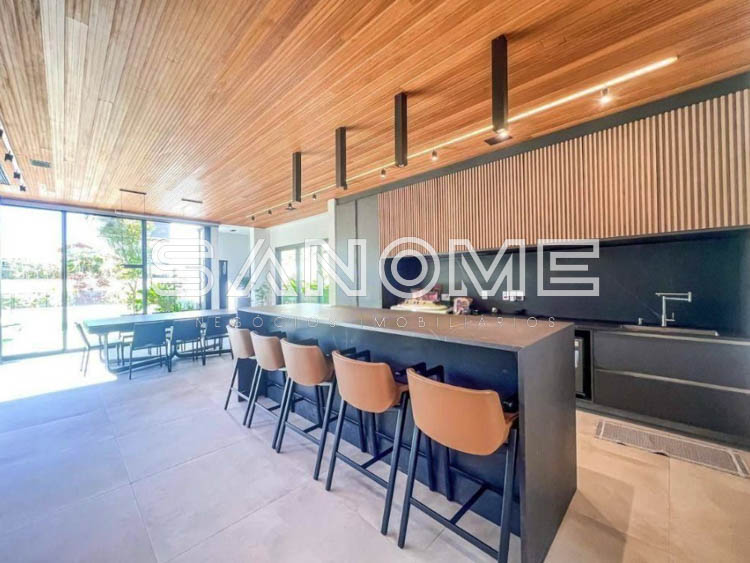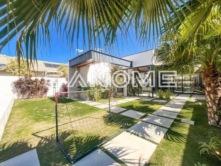 Térrea, 4 suítes (master com amplo closet e banheira), Lavabo, Sala 3 ambientes com pé direito duplo, Sala de TV privativa, Cozinha gourmet integrada, Despensa, Área social, Varanda externa, Área gourmet com banheiro, Amplo quintal gramado, Academia privativa e Piscina aquecida com prainha, raia e SPA.