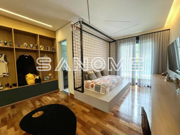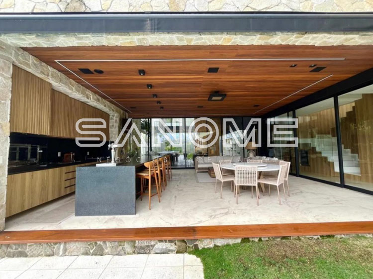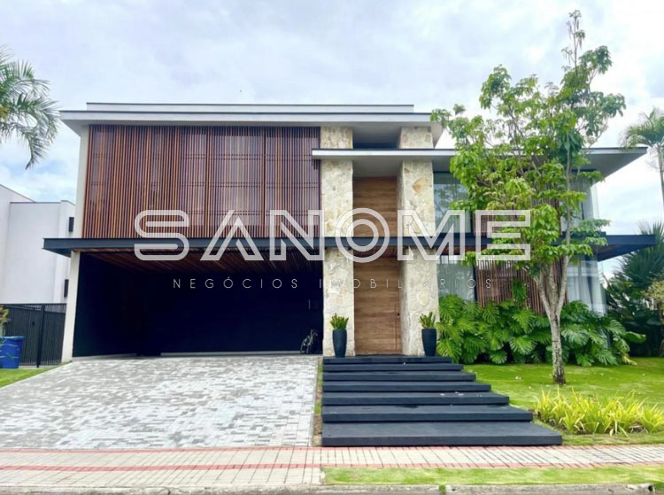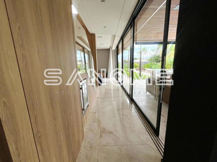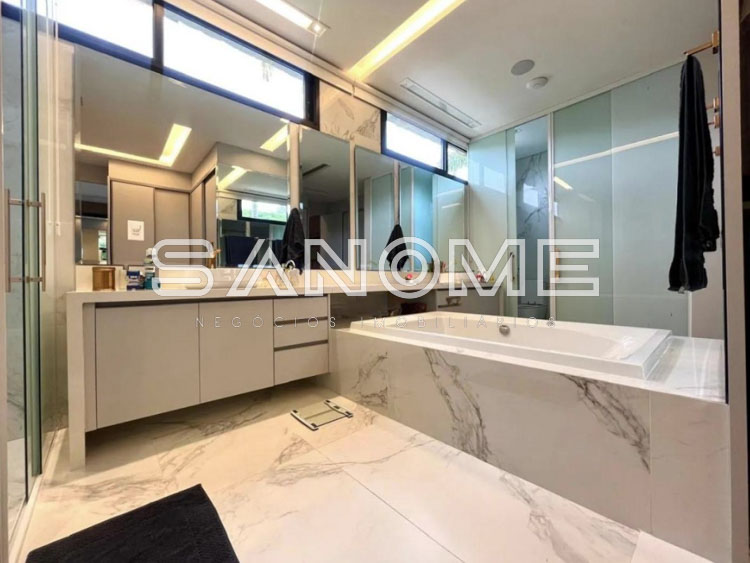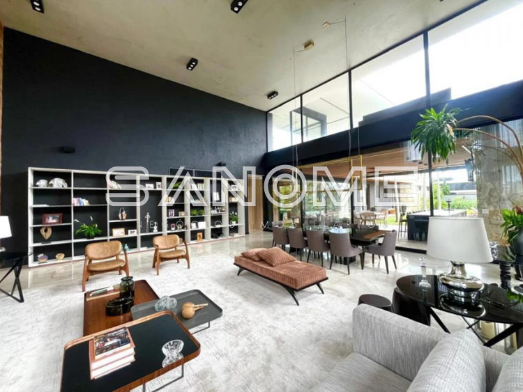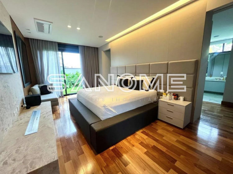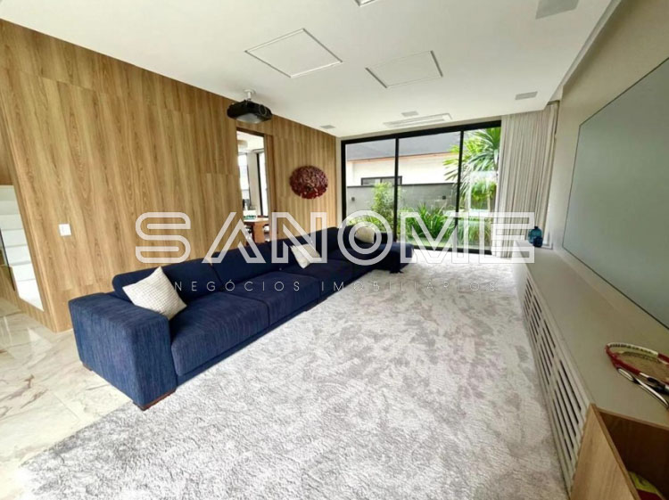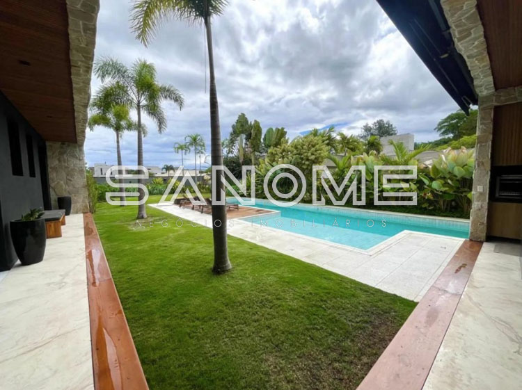Piso térreo: 4 suítes, Sala de estar com pé direito duplo, Sala de jantar, Lavabo, Sala de cinema, Escritório, Adega, Cozinha planejada, Copa, Despensa, Área de serviço com banheiro, Área gourmet, Banheiro de lazer, Sauna, Quintal gramado e Piscina com raia e prainha.