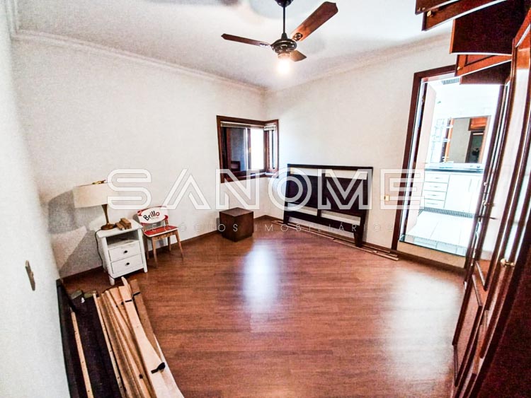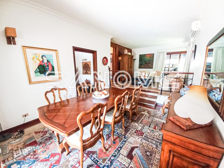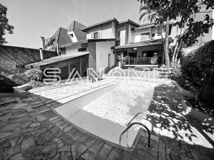 Piso térreo: Hall de entrada, Sala de jantar, Sala de estar, Lavabo, Sala de TV privativa, Sala de almoço, Escritório, Ampla varanda externa, Cozinha planejada, Copa, Despensa, Área de serviço, Quarto e banheiro de empregados, Amplo quintal gramado, Área de churrasqueira e Piscina.