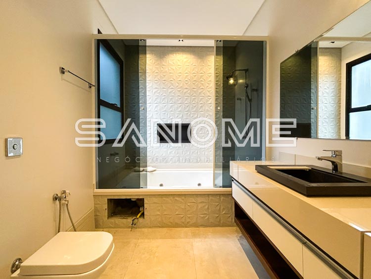 Piso superior: Sala íntima entre os quartos + 3 suítes (2 com closet e banheira).