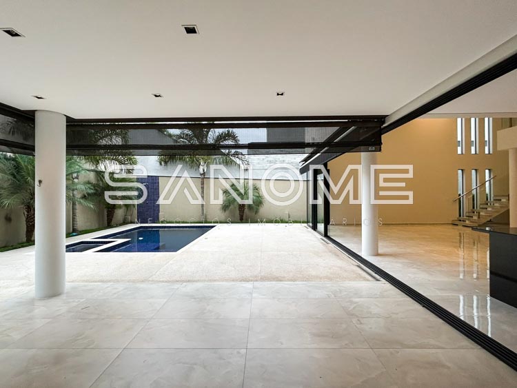 Piso térreo: Salas integradas com pé direito duplo, Escritório/Suíte, Lavabo, Elevador, Cozinha integrada, Área de serviço com armários e banheiro de empregados, Área gourmet com banheiro social e Piscina com spa e prainha.