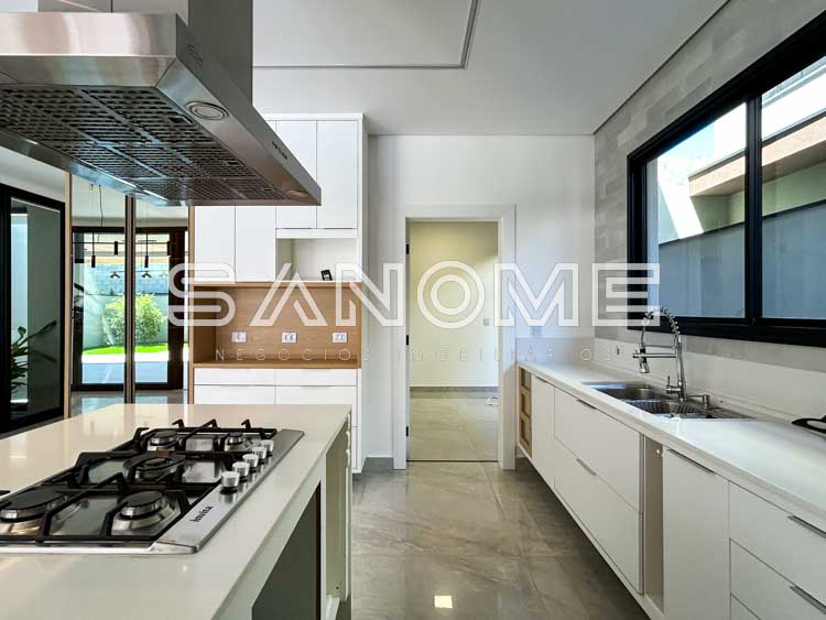 Piso térreo: Hall de entrada, Lavabo, Escritório (1 súite), Salas integradas com pé direito duplo, Cozinha integrada, Despensa, Área de serviço, Varanda gourmet com fechamento em vidro, Quintal gramado, Banheiro de lazer externo e Piscina com prainha.