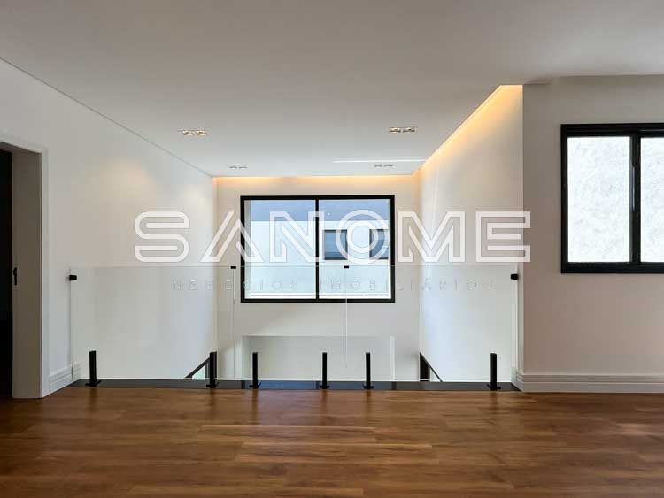 Piso superior: Sala íntima entre os quartos + 4 suítes (master repleta de armários e sala de banho com banheira).