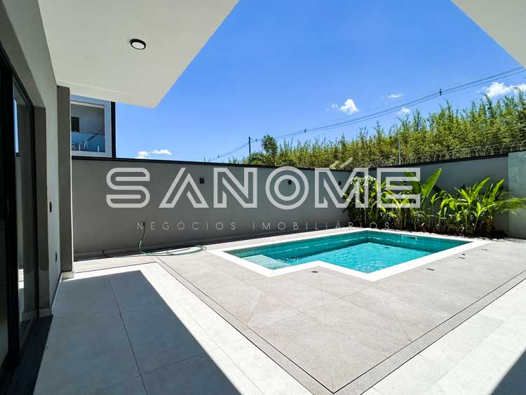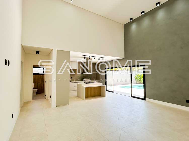 Térrea, 4 suítes (master com closet e sala de banho com hidromassagem), Escritório/Sala de TV, Salas integradas com pé direito duplo, Lavabo, Hall de entrada, Cozinha integrada (com eletrodomésticos), Área de serviço, Quintal com paisagismo e Piscina aquecida e iluminada.