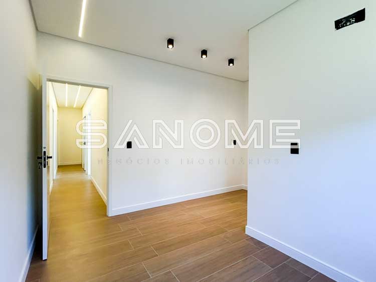 Térrea, 4 suítes (master com closet e sala de banho com hidromassagem), Escritório/Sala de TV, Salas integradas com pé direito duplo, Lavabo, Hall de entrada, Cozinha integrada (com eletrodomésticos), Área de serviço, Quintal com paisagismo e Piscina aquecida e iluminada.