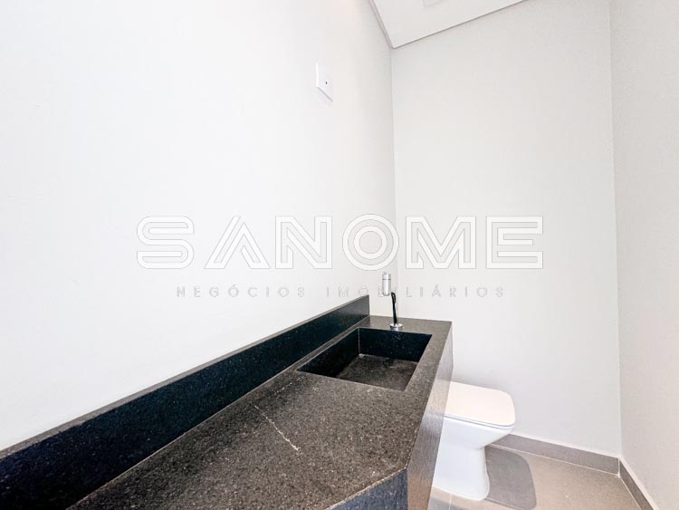 Piso térreo: Sala 3 ambientes, Lavabo, Cozinha integrada, Área de serviço com quarto de depósito, Área gourmet integrada, Amplo quintal gramado, Varanda externa, Banheiro de lazer e Piscina.