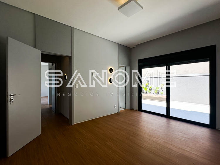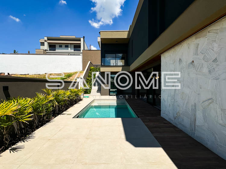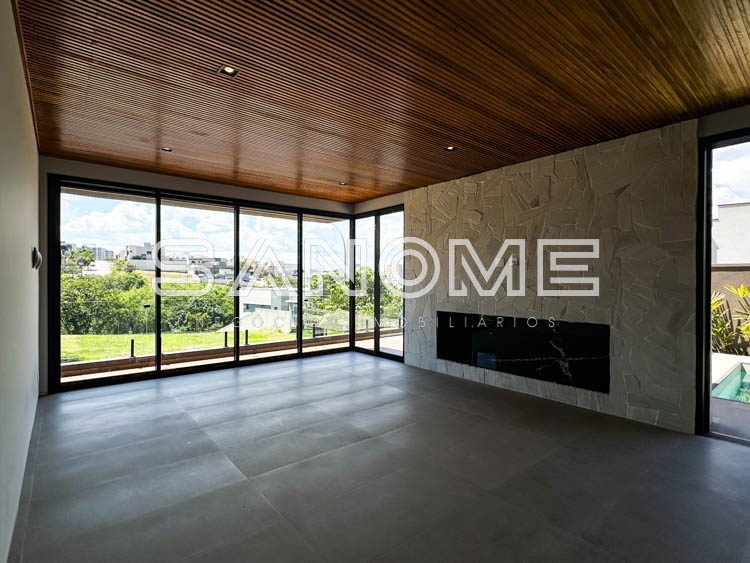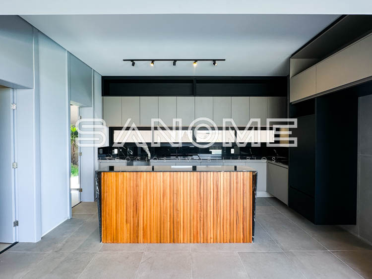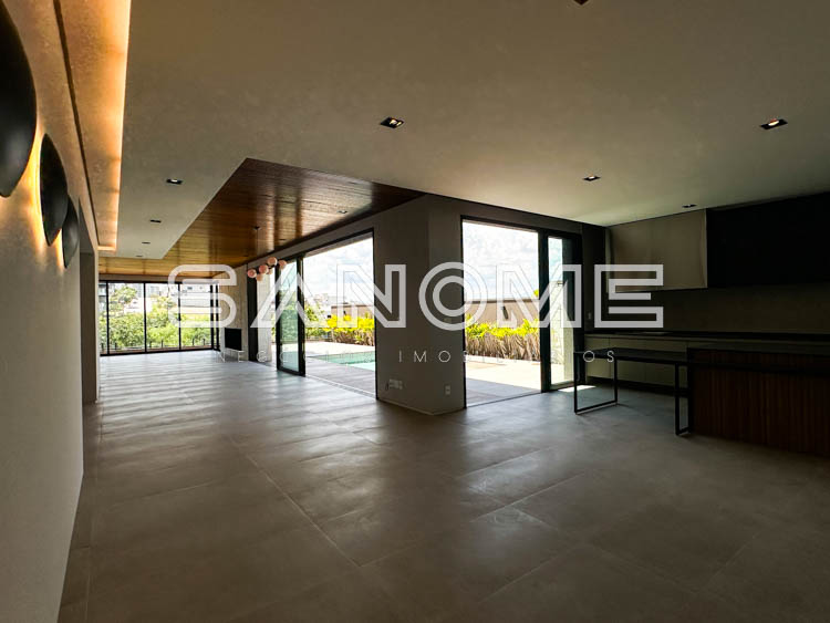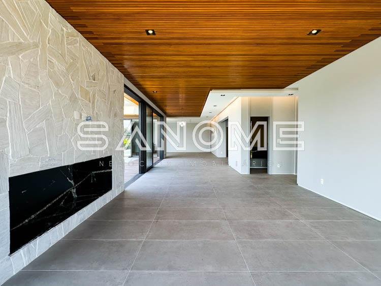 Piso principal: Salas integradas (sala de estar com lareira), Lavabo, Cozinha integrada completa, Área de serviço com banheiro de empregados, Área gourmet com banheiro de lazer, Área social nos fundos (integrada aos quartos) e Piscina com prainha.