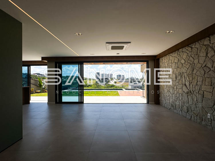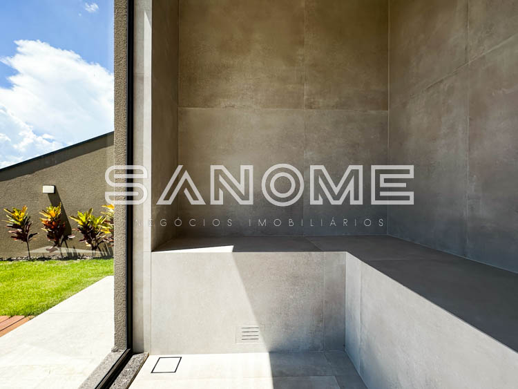 Piso térreo: Salas integradas, Lavabo, Hall de entrada, Cozinha gourmet integrada(com eletrodomésticos), Área de serviço, Quintal gramado, Banheiro de lazer externo, Sauna e Piscina com borda infinita e spa.