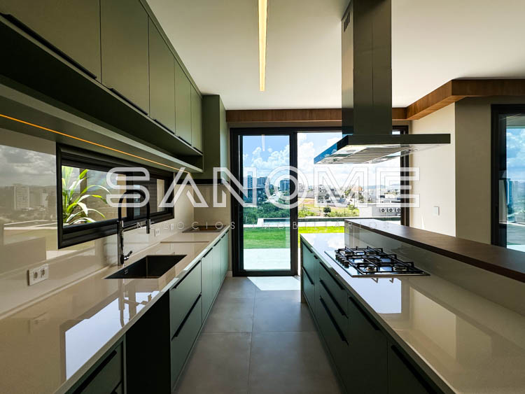 Ar condicionado, Sistema de energia fotovoltaica com 9 placas solares, Aquecimento solar com boiler, Automação, Internet em todos os cômodos, Paisagismo, Hobby box e Carregador para carros elétricos.