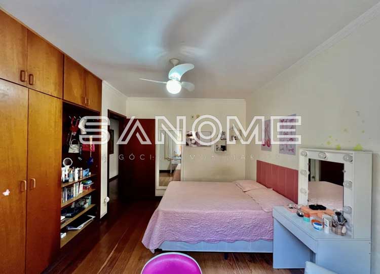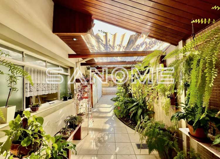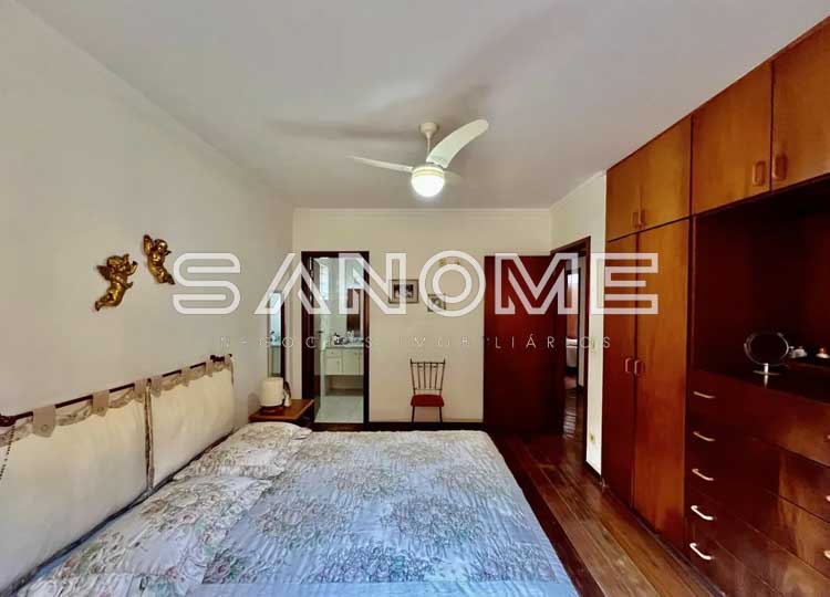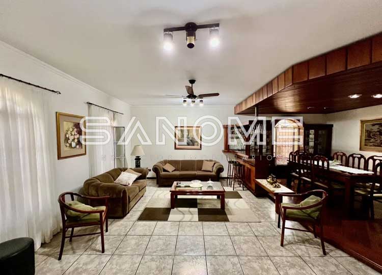 Piso térreo: 3 dormitórios (1 suíte), Banheiro social, Sala social, Sala de estar, Sala de jantar, Cozinha planejada, Copa com saída para lateral da casa, Área de serviço nos fundos com quarto e banheiro de empregados e Área de churrasqueira coberta (com forno de pizza).