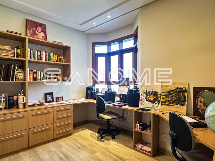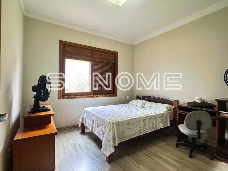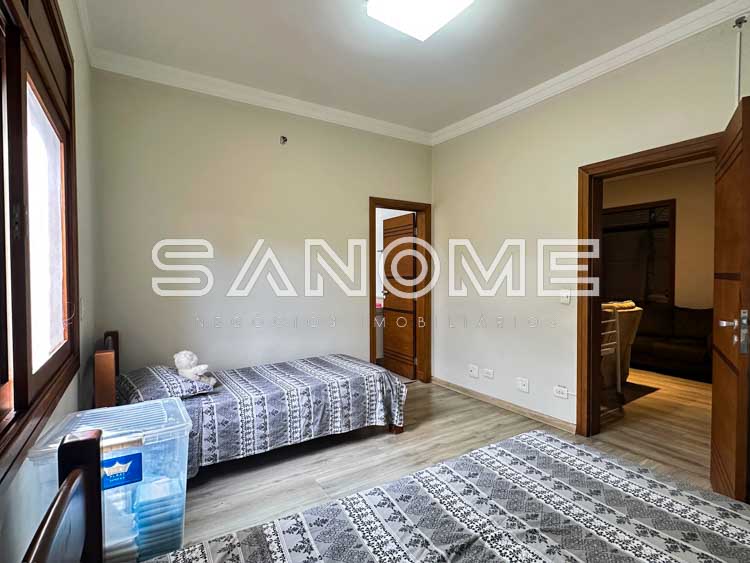 Térrea, 3 suítes (master com closet e banheira), Sala de estar com lareira, Sala de jantar, Lavabo, Escritório, Sala de TV entre os quartos, Cozinha planejada, Área de serviço (com despensa, quarto e banheiro de empregados), Varanda externa, Área de churrasqueira e Imenso quintal gramado.