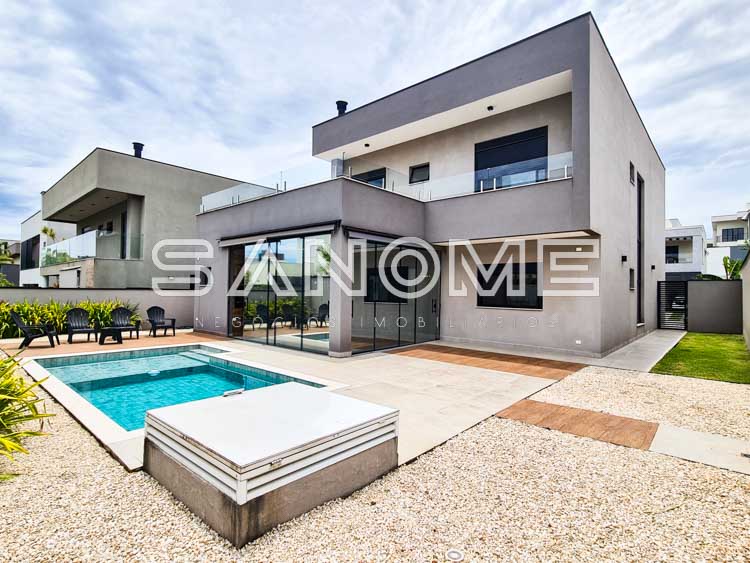 Piso térreo: 1 suíte, Sala de estar, Sala de TV, Lavabo, Sala de jantar, Cozinha integrada, Despensa, Área de serviço, Área gourmet com fechamento em vidro, Banheiro de lazer e Piscina.