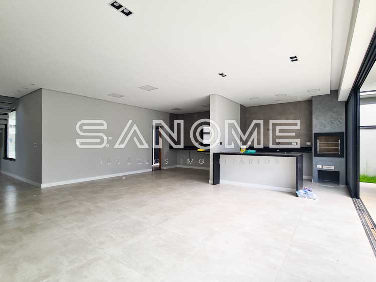 Piso térreo: Sala 3 ambientes integrados, Escritório (reversível +1 suíte), Banheiro social, Área gourmet com churrasqueira, Cozinha integrada, Área de serviço, Quarto multiuso externo (academia, brinquedoteca, etc.), Banheiro de lazer externo e Piscina com prainha.