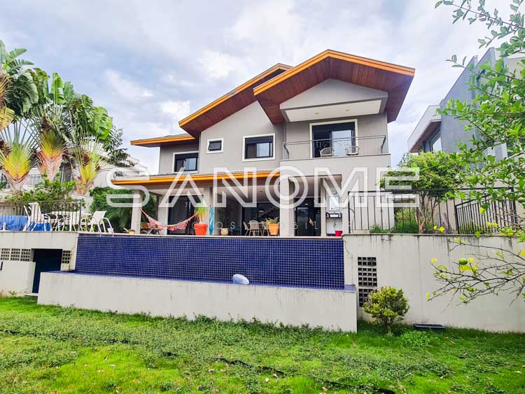 Piso inferior: Sala de jantar, Sala de estar com lareira, Lavabo, Sala de TV, Cozinha planejada, Despensa, Área de serviço, Área gourmet completa, Banheiro externo, Jacuzzi, Quintal gramado nos fundos e Piscina com borda infinita.
